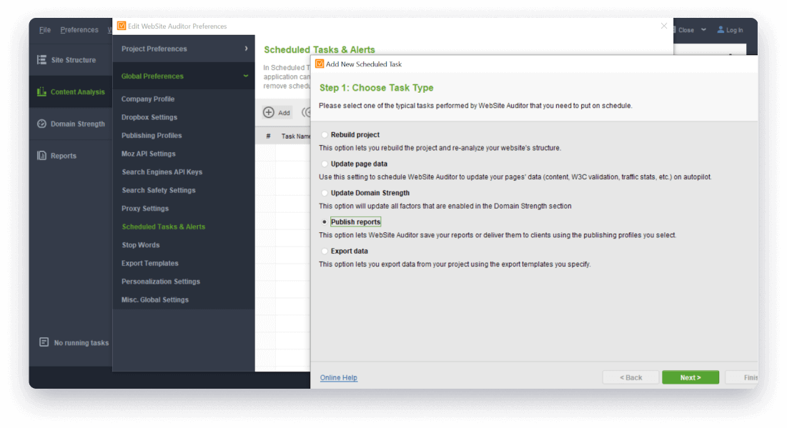 WebSite Auditor lets you generate PDF and HTML SEO reports. First, go through all fields to add or remove the dimensions and metrics you want to include in the report. Then choose whether you want to save the SEO report to your computer or share it with your clients directly. To deliver the report by email, hit Publish, specify your company information, the sender's name, email address, and credentials. Then add the recipient's address, and proceed with sending the email. You can add a white label to generate branded SEO reports. And the best part, you can set up generating and sending site audit reports in an automated workflow.