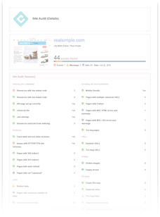 A website audit report is an overview of all technical errors on a website, including on-page and off-site SEO factors. Typically, site audits cover crawlability issues (duplicate URLs, broken links, bad redirects), on-page SEO factors (unoptimized titles, meta descriptions, page speed issues, mobile friendliness) as well as off-site signals (unnatural backlinks, security, penalties from Google).
