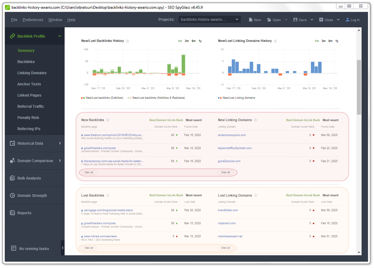 New/Lost Backlinks/Domains History allows you to see the number of the backlinks and linking domains gained or lost over a certain period of time in the past, and spot any drastic changes to your backlink profile.