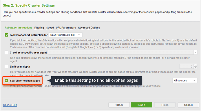 To find the site's orphan pages, we ran a check using the advanced crawler settings: