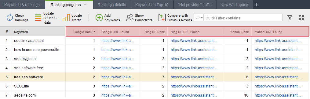 When done, Rank Tracker will show you a table with your current ranking positions in selected search engines.