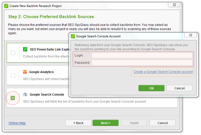 You can connect the GSC account to any project in SEO SpyGlass during the initial setup if you enable expert options and select Google Search Console among preferred backlink sources (the wizard will pop up asking you to enter the account details). If you don't have the account, you can use the in-built link to create one.