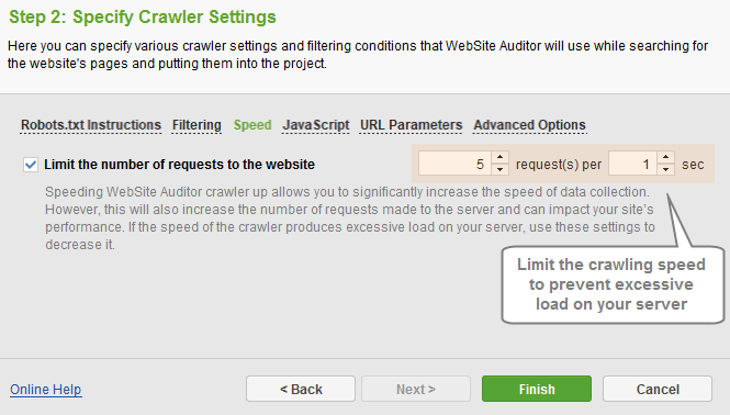 The Speed section allows limit the number of requests to the website, to decrease the load on the server. This prevents slower sites (or sites with high security restrictions) from blocking the crawler.
