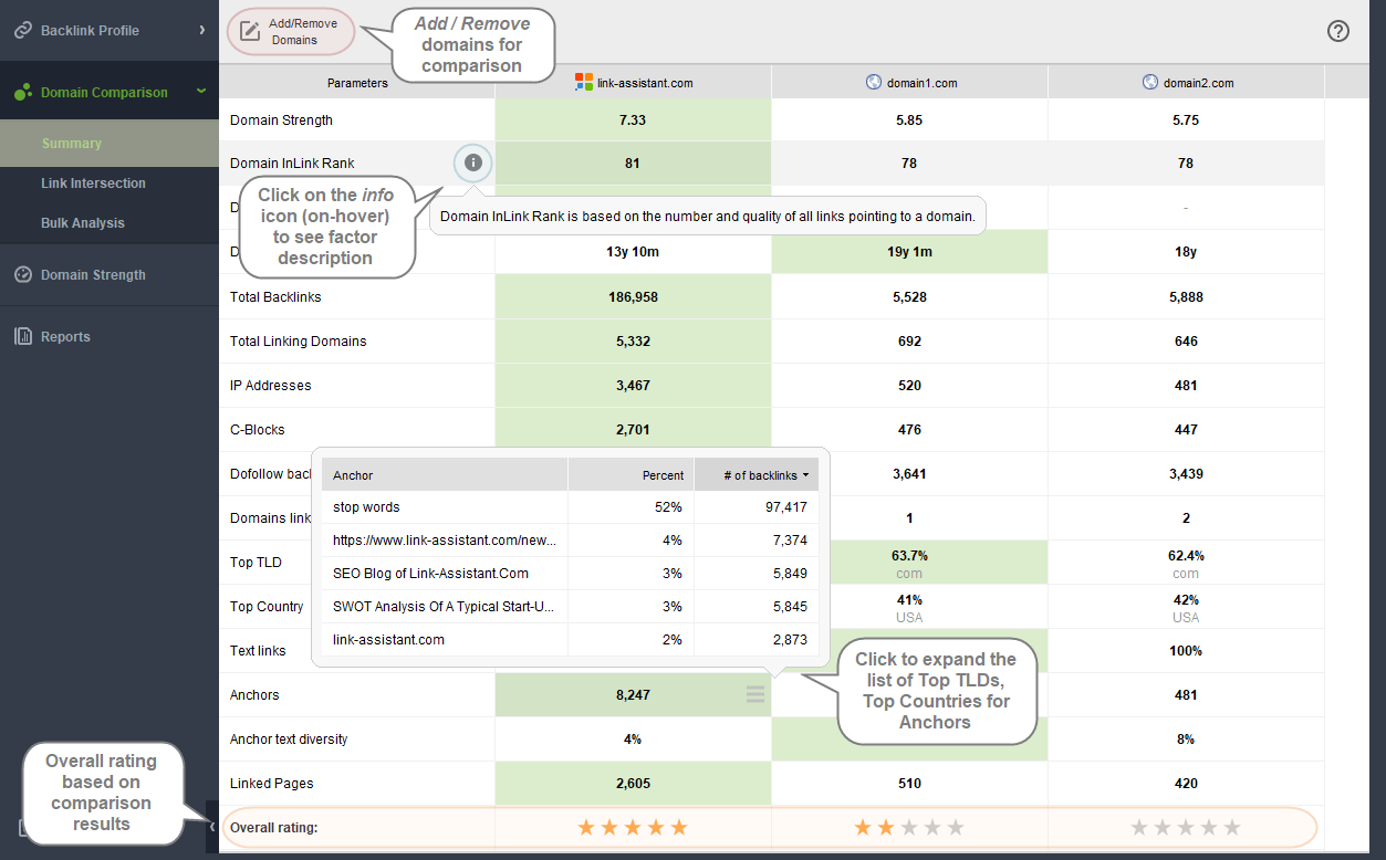 The Summary module displays the overall comparison of the involved domains: you'll see the factors listed on the left and each domain's stats for each factor. The best result for each factor will be highlighted in green so that you could easily spot the domain that has the most winning characteristics. At the bottom, you will also see the Overall rating calculated for the displayed domains (from 1 star to 5).