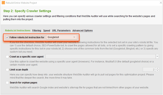 To check if this is a problem on your site, go to your WebSite Auditor project and click Rebuild Project. At Step 1, check the Enable expert options box. At the next step, select Googlebot to in the Follow robots.txt instructions for… option.