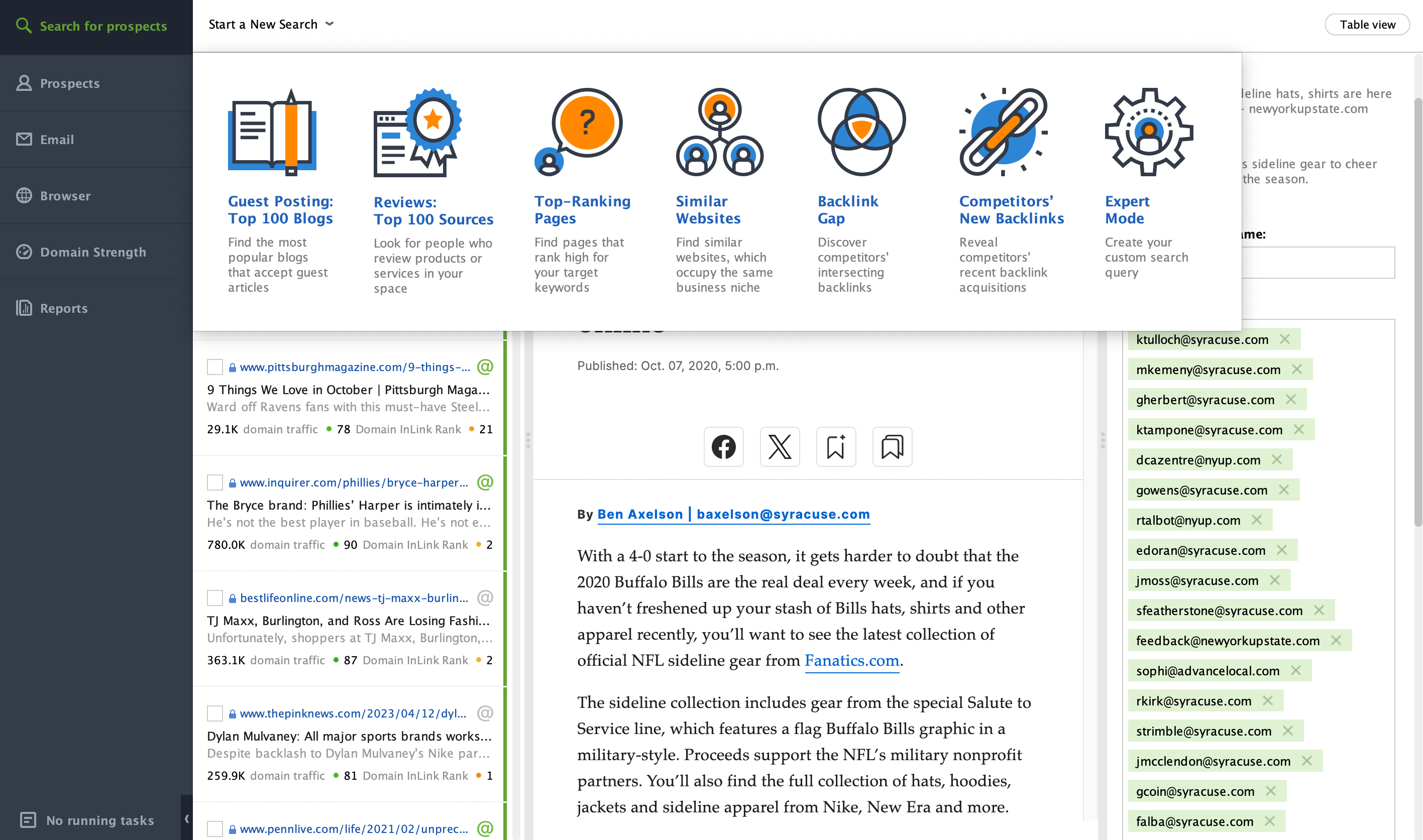 If you don’t have a list of websites for guest posting, use LinkAssistant. The tool helps you identify relevant websites and track your outreach efforts. To do that, head to the Search for prospects module and click Guest Posting: Top 100 Blogs. The tool will show relevant resources and contact emails for outreach.