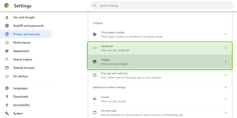 So, here is how to fix to fix broken images if you use Chrome. In your browser settings, examine Privacy and Security > Site settings and review the Content section. Here, make sure that it shows Sites can show images and Sites can use Javascript (as some websites may employ JS for lazy-loading images to optimize page speed).