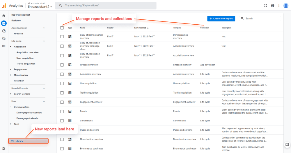 The reports can be grouped into collections. There are two predefined collections called Lifecycle and User, with topics unwrapped with the down arrow, and reports inside them.
