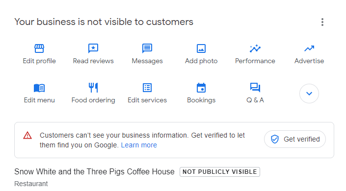 Say your business is a cafe. If your legal business name doesn’t include words like cafe or coffee, you should add them to your name in GBP to get something like Snow White and the Three Pigs Coffee House.