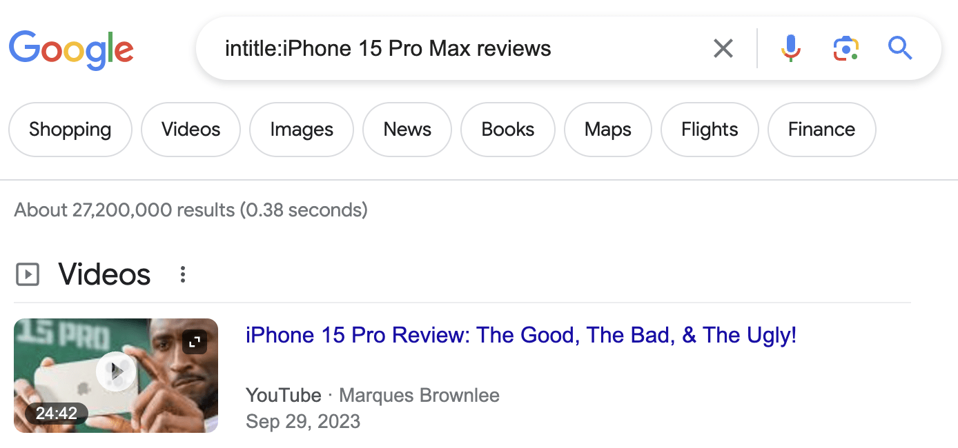 Value: Using the intitle: operator can be especially beneficial for locating reviews, discussions, or information about a particular topic or brand. From an SEO perspective, it’s a great way to find exact keywords in titles.