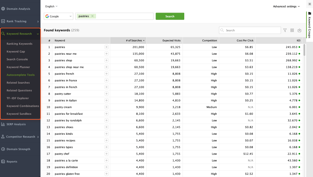In Rank Tracker, you can easily check and compare keywords’ KEI in a dedicated column during your research.