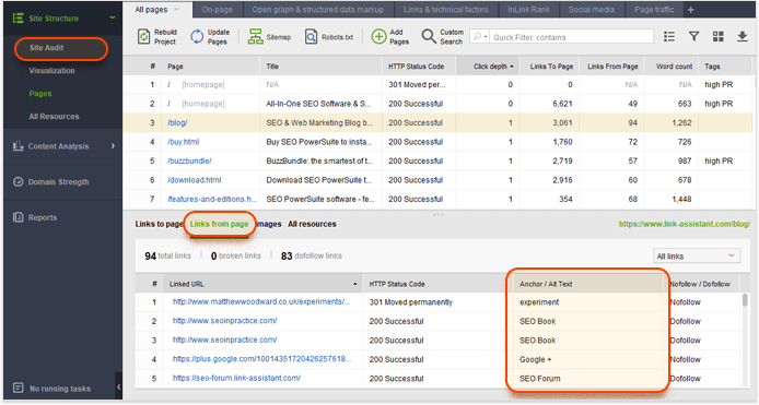 To audit internal anchor text, launch WebSite Auditor once more. Under the Pages dashboard, click on any one of the pages. Below, click on Links from page to see every link on the page along with its anchor text, HTTP response code, and robots directives.