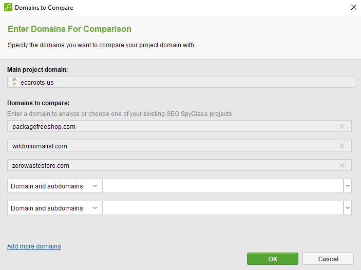 2. Now you can check the backlinks of your competitors with SEO SpyGlass. Go to Domain Comparison and add the competitors you’ve just found.