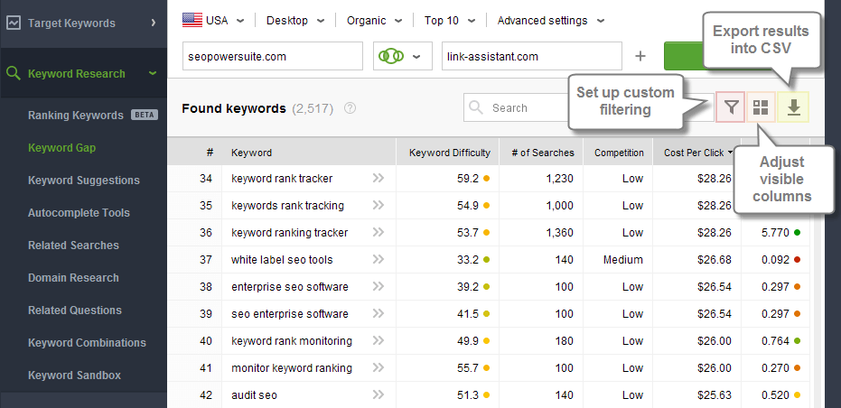 Keyword Gap research method lets you run a side-by-side comparison of up to 5 domains, to explore the differences and similarities between their keyword profiles and yours: