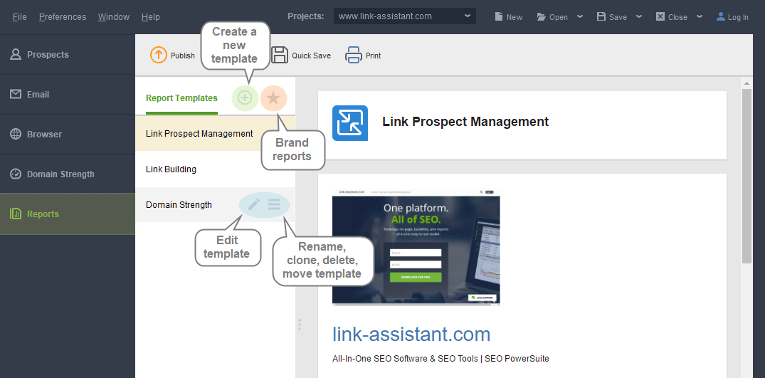 LinkAssistant offers a set of customizable report templates that can be saved as HTML or PDF files and delivered to clients via e-mail, as a shareable link, or uploaded to an FTP server.
