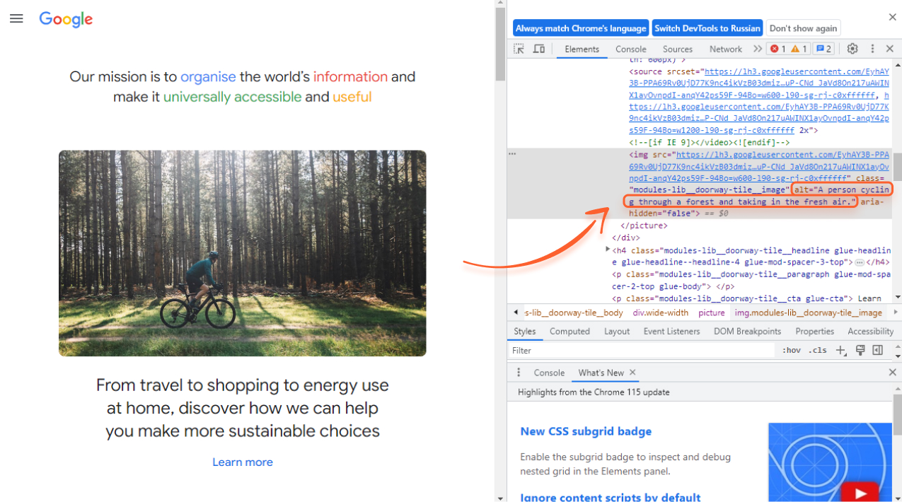 First, you need to open the needed page, right-click on an image, and then click Inspect or Inspect element. On the right, you will see Developer Console, where you can see the exact alt text of the image.