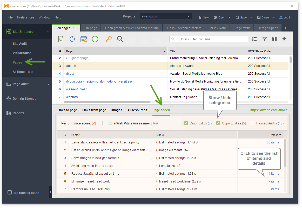 Unlike most other tools, WebSite Auditor allows you to analyze the pages in bulk to see all the found issues, diagnostics and opportunities for your whole website.