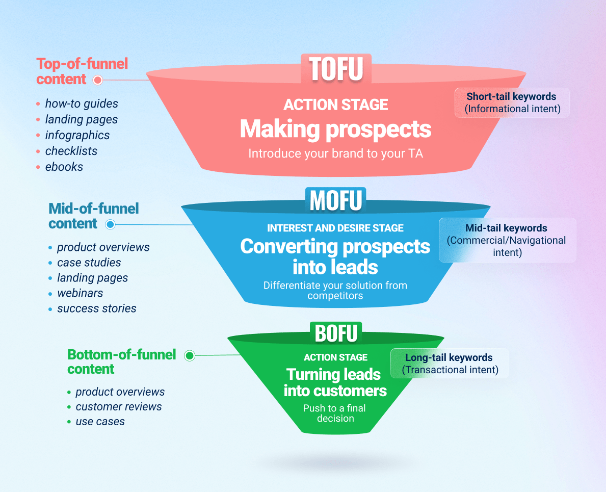 At different stages they need different types of content. And in general, there should be enough SEO content for each funnel stage. Now, let’s go over the details.