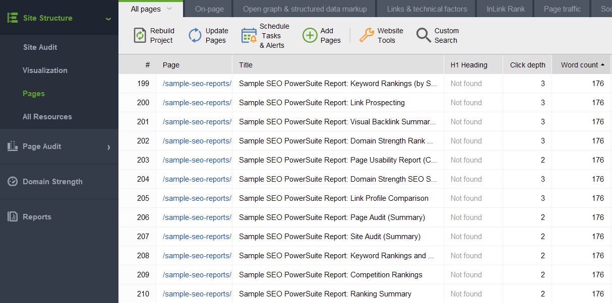 First, you need to see if there are any pages with thin content on your website. It is easy to check it with the WebSite Auditor tool by filtering all your pages by Word Count metric in the Site Structure > Pages submodule.