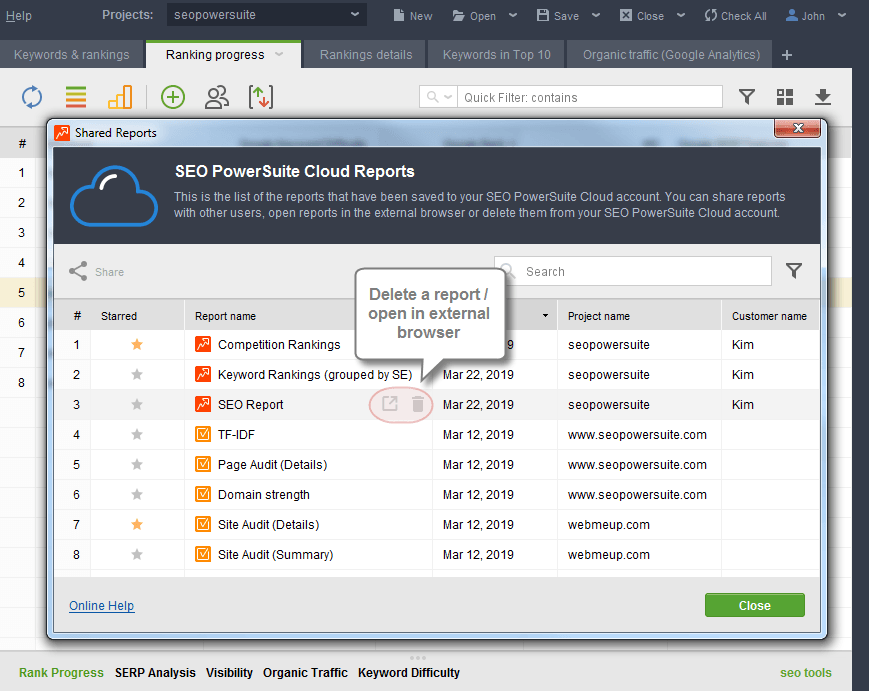 SEO PowerSuite Cloud also offers saving and sharing reports online. Here you may read how to save a report to the cloud storage.