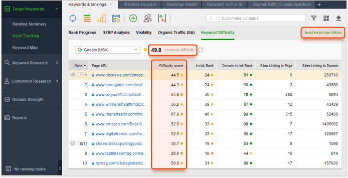 In the example above, I have checked the ranking difficulty for the 'best exercise bikes' topic, and it looks like the competition is very strong. All but two competitor websites have tens of thousands of backlinks, which means that it would be very difficult to outrank them without a comparable backlink profile.