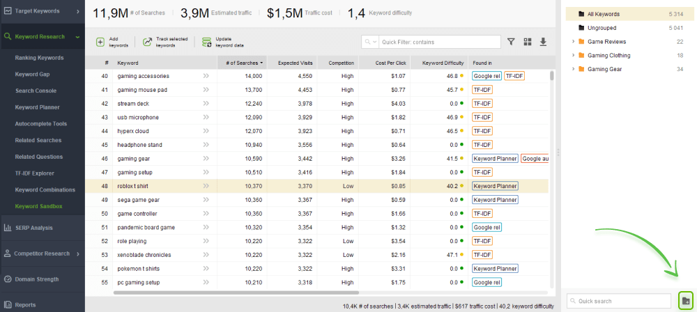 Note that all the keywords you’ve collected will automatically appear in the Keyword Sandbox tab. Operate from there from now on.