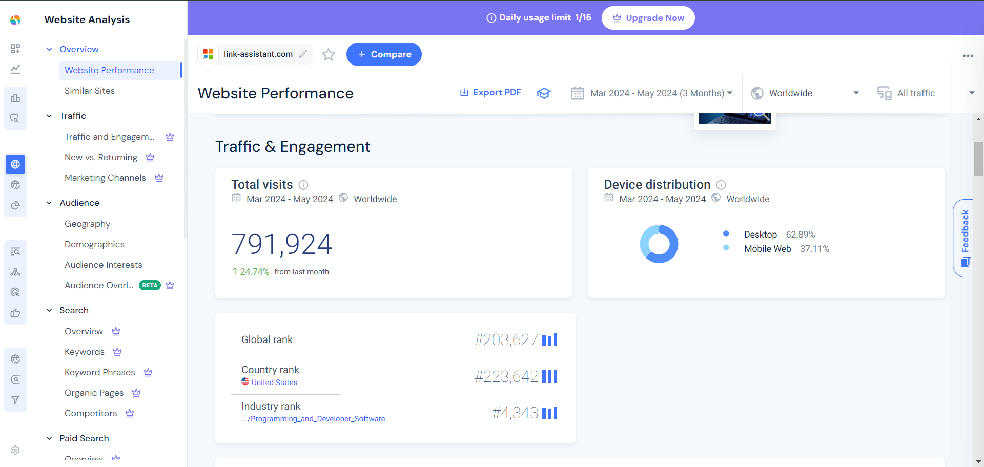 Similarweb is a platform that provides a comprehensive compilation of website traffic data. It offers insights into website traffic, user engagement, and audience geography. In addition, Similarweb provides other valuable metrics for businesses and organizations, such as paid and referral traffic insights.