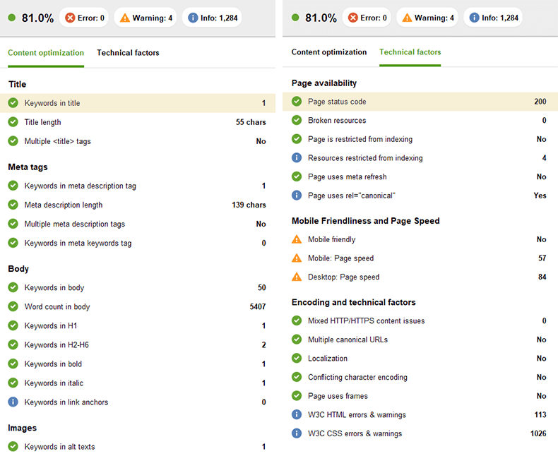 It was also very easy to compare the amount of text in the body content to that of competitors, although in this case the client had a really substantial amount of text (over 5,000 words) so I had no concerns there.