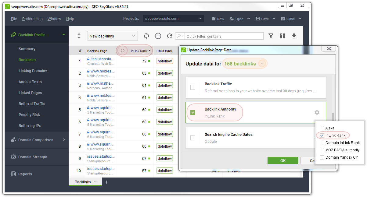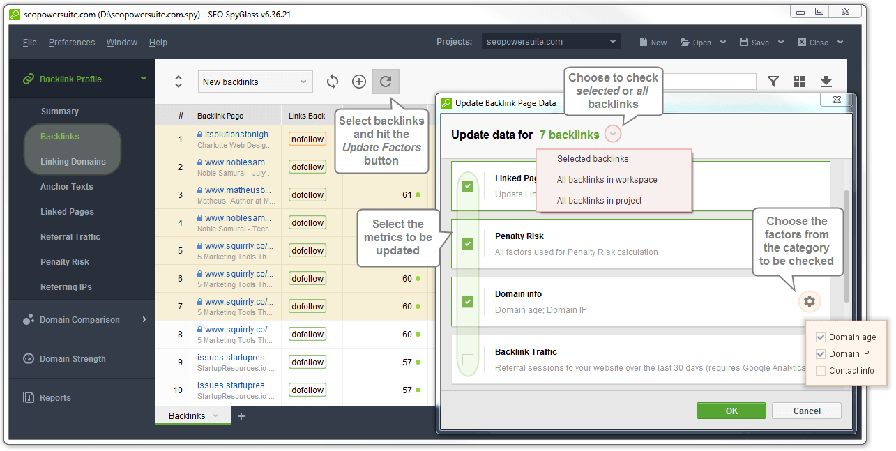 Finally, you can update any specific factor by hovering over its column header - the update icon will apper. Once you click on it, the wizard will pop up with that specific factor selected. By default, it will be updated for all backlinks, unless you change it to selected backlinks.