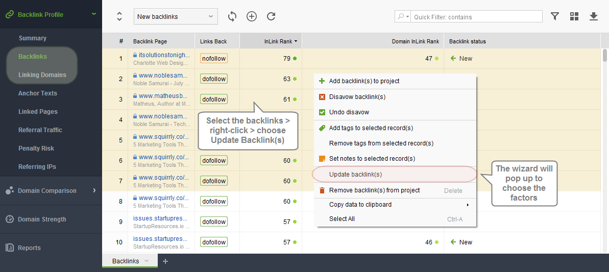 Alternatively, you can update any factors for selected backlinks from the context menu right from the workspace: select the backlinks > right-click on the list > choose Update Backlink(s), and the wizard will pop up to choose the factors.