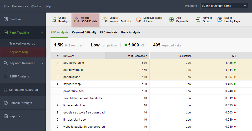 RankTracker lets you update and work with a wide variety of factors that may facilitate your keyword research process: check KEI index, do competition assessment, update search volume, Cost per Click, expected visits and some other factors. Most of these metrics are based on data taken from Google Ads Keyword Planner Tool.