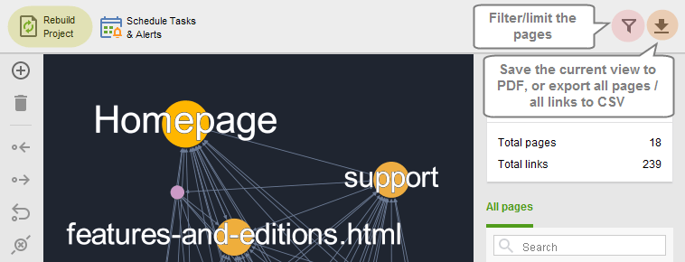 The Visualization module provides you with an actionable graphical map, showing the structure of your site and the distribution of internal links between pages.
