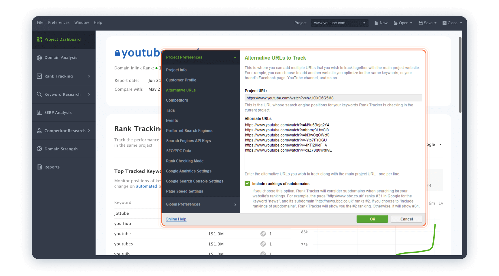 Use SEO PowerSuite's Rank Tracker as a YouTube rank-tracking tool to monitor the performance of your video content. Make more people see your videos in search with the help of metadata optimization and video SEO best practices. A bit of SEO with the consideration of the YouTube ranking factors will help your videos rank higher both on YouTube and Google SERPs.